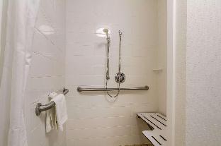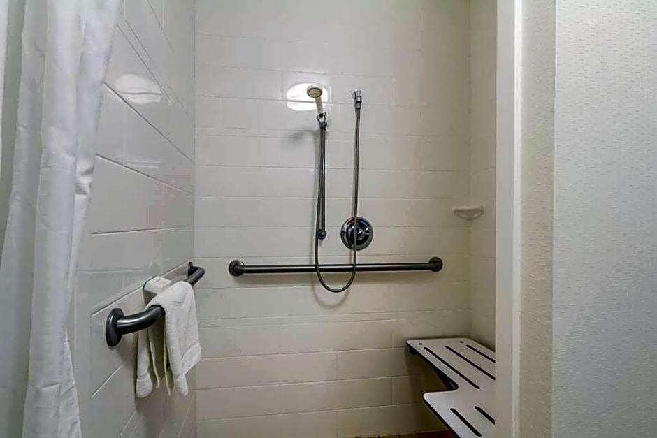 This mobility and hearing accessible, non-smoking room features one king-sized bed, and an accessible roll-in shower. The room also has a visual alarm and notification devices for the doorbell or door knock and incoming phone calls. The room features comfortable soft seating, microwave, refrigerator, a HDTV, and easy to operate alarm clock/radio. The free WiFi access will help you stay connected while on the road. If you prefer not to work at the desk, you can use the convenient lapdesk instead. You'll also enjoy the convenience of having a coffeemaker with tea service and iron/ironing board in your room. Any corresponding photo may not reflect the specific accessible room type or room feature.