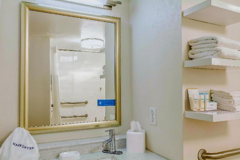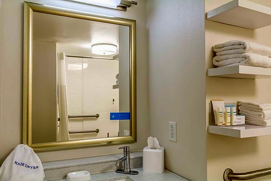 This hearing accessible, non-smoking room features one king-sized bed with sofa bed. The room also has a visual alarm and notification devices for the doorbell or door knock and incoming phone calls. The room features our clean and fresh Hampton bed, comfortable sofa bed, microwave, refrigerator, a HDTV, and easy to operate alarm clock/radio. In the bath you will enjoy a WaterPik showerhead and curved shower rod. The free WiFi access will help you stay connected while on the road. If you prefer not to work at the desk, you can use the convenient lapdesk instead. You'll also enjoy the convenience of having a coffeemaker with tea service and iron/ironing board in your room. Any corresponding photo may not reflect the specific accessible room type or room feature.