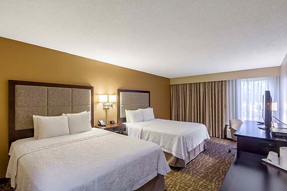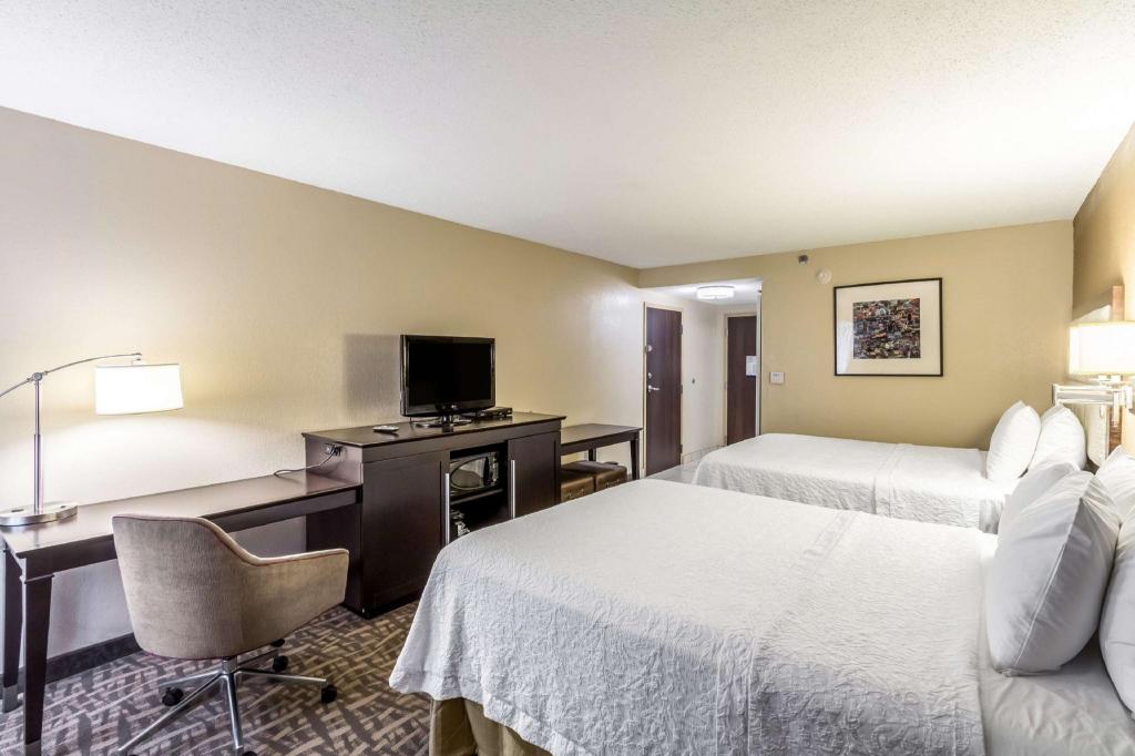 This hearing accessible, non-smoking room features two queen-sized beds. The room also has a visual alarm and notification devices for the doorbell or door knock and incoming phone calls. The room features our clean and fresh Hampton bed, comfortable soft seating, a HDTV, and easy to operate alarm clock/radio. In the bath you will enjoy a WaterPik showerhead and curved shower rod. The free WiFi access will help you stay connected while on the road. If you prefer not to work at the desk, you can use the convenient lapdesk instead. You'll also enjoy the convenience of having a coffeemaker with tea service and iron/ironing board in your room. Any corresponding photo may not reflect the specific accessible room type or room feature.