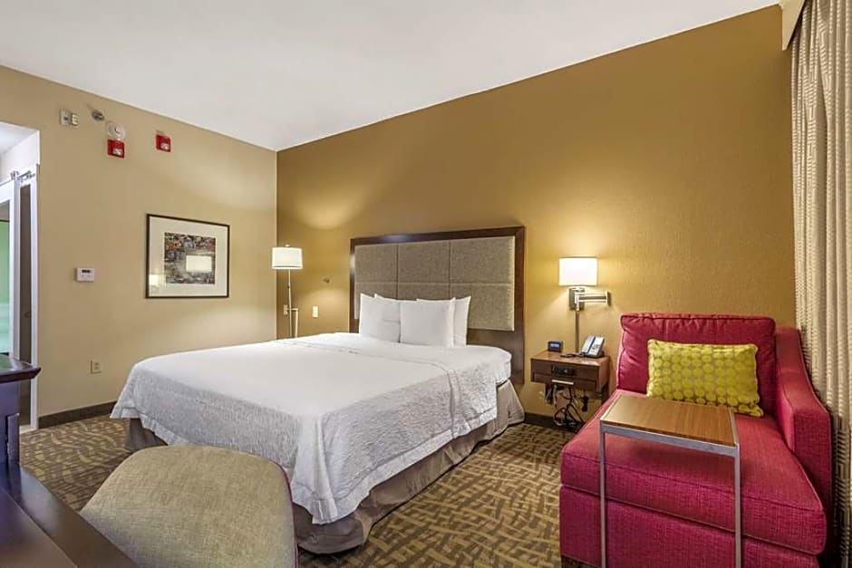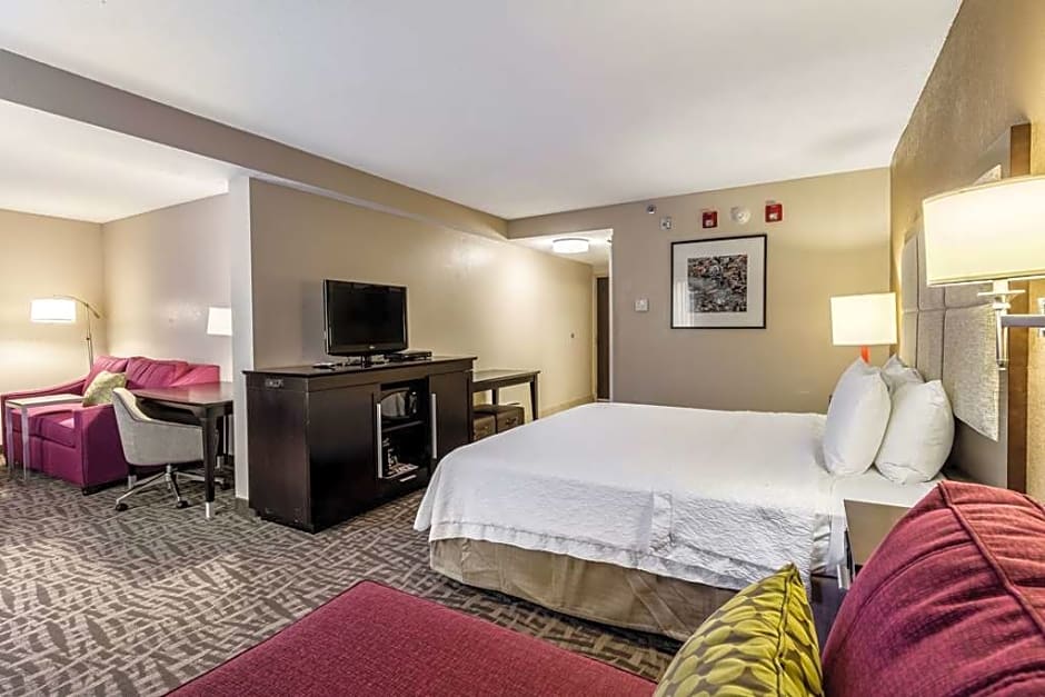 Whirlpool, sofa bed, lounge chair, desk, TV, free WiFi Relax in this two-room king suite with a clean and fresh Hampton bed® and whirlpool tub. Sink into the sofa bed, lounge chair or recliner and watch movies on the HDTV. Surf the web with free WiFi. Catch up with work at the desk with ergonomic chair. Refresh your senses in the bathroom, complete with shower and plush towels. Enjoy the convenience of having a coffeemaker in the room.