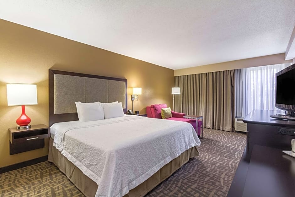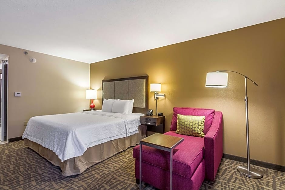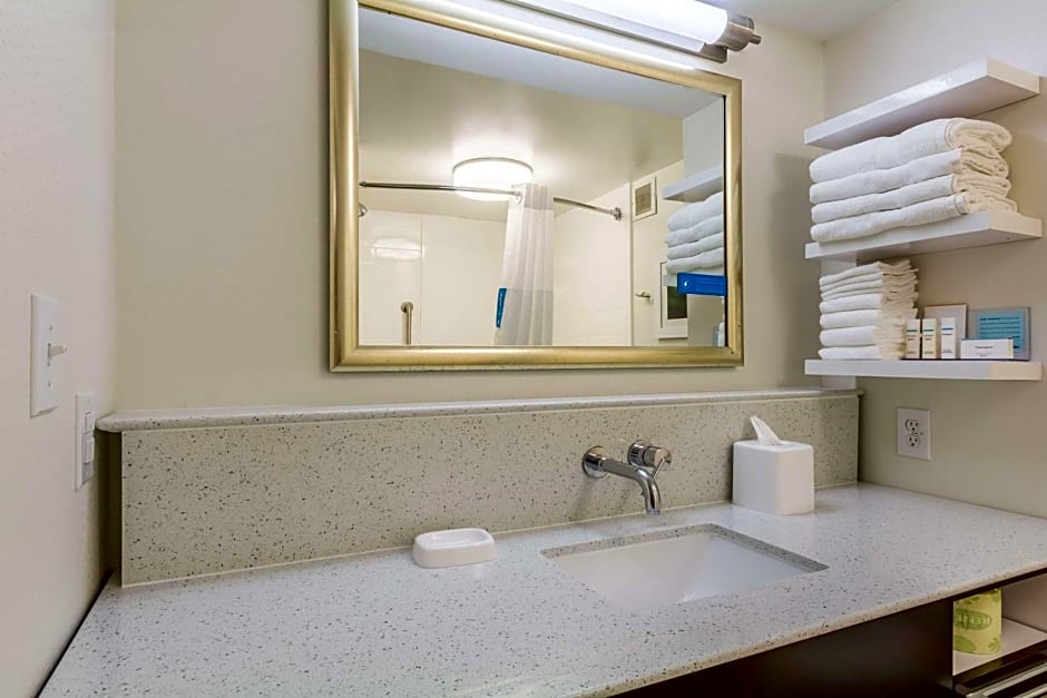 This hearing accessible, non-smoking room features one king-sized bed. The room also has a visual alarm and notification devices for the doorbell or door knock and incoming phone calls. The room features our luxurious clean and fresh Hampton bed, comfortable soft seating, microwave, refrigerator, a HDTV, and easy to operate alarm clock/radio. In the bath you will enjoy a WaterPik showerhead and curved shower rod. The free WiFi access will help you stay connected while on the road. If you prefer not to work at the desk, you can use the convenient lapdesk instead. You'll also enjoy the convenience of having a coffeemaker with tea service and iron/ironing board in your room. Any corresponding photo may not reflect the specific accessible room type or room feature.